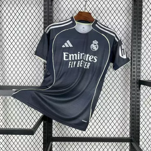 A Camisa Real Madrid Away 25/26, assinada pela Adidas, chega com um visual moderno, minimalista e imponente — dominado pelo preto com linhas cinzentas sutis, contrastando com detalhes em verde-limão fluorescente.