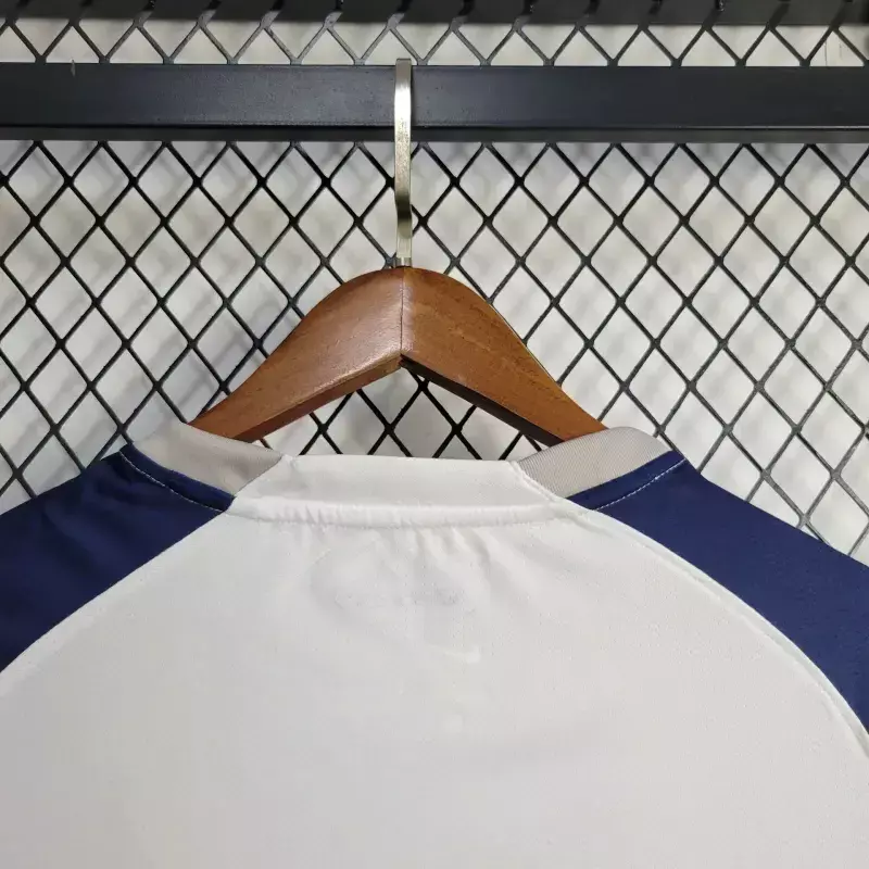 O design em branco puro é realçado por painéis azul-marinho e detalhes em lilás nas mangas, transmitindo a identidade única do Tottenham Hotspur.